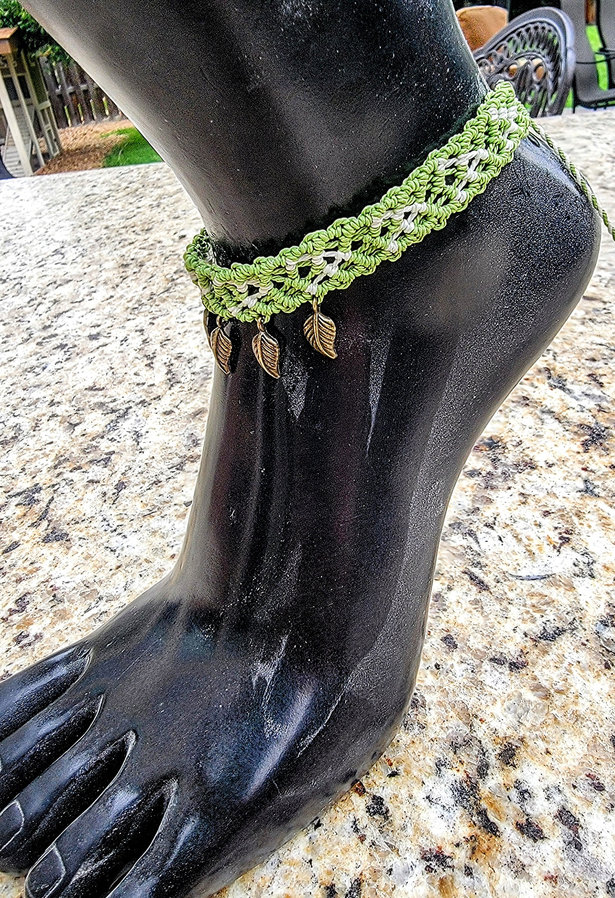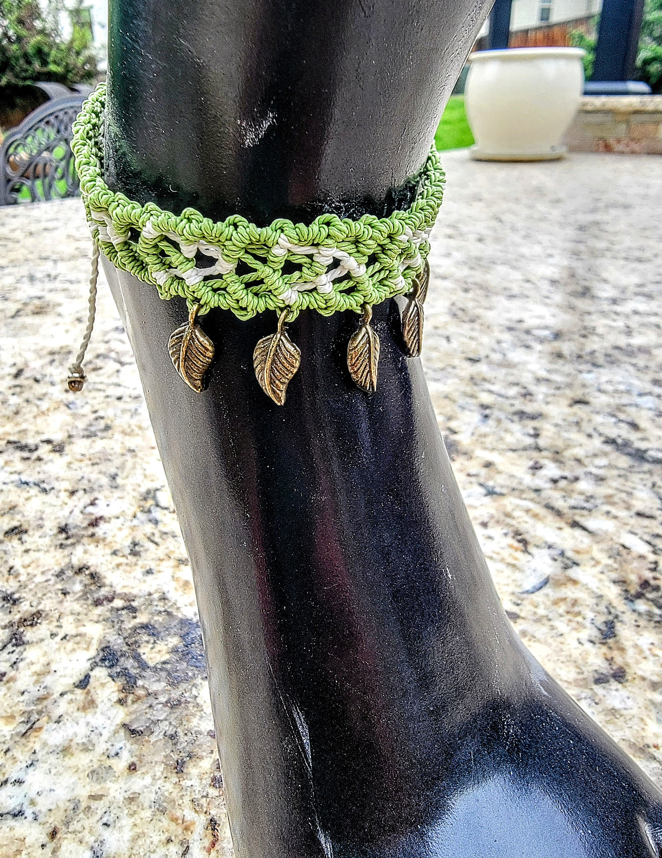 Gorgeous and lovingly knotted anklet adorned with bronze leaf charms. Waterproof, waxed thread is remarkably tough yet soft and comes in an array of bold colors.