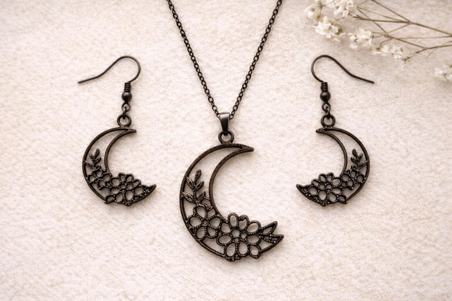 Lovely and minimalist. A pair of black flowering vine and moon earrings and necklace.