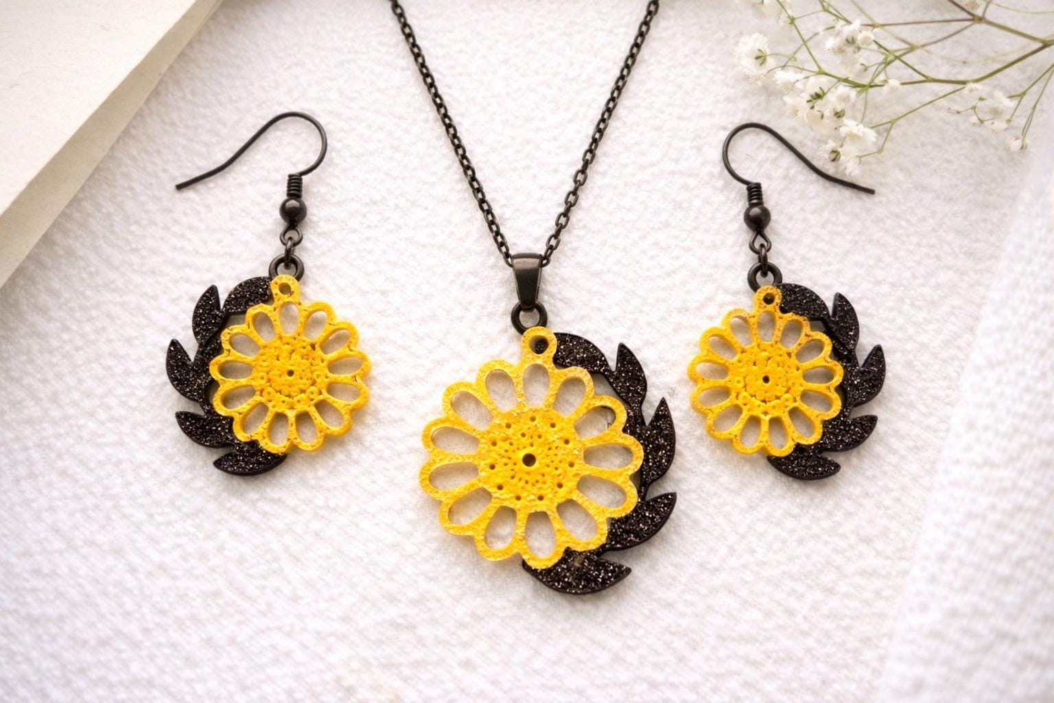 Lovely and minimalist. A pair of black and yellow Sunflower earrings and necklace.